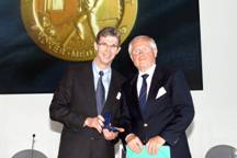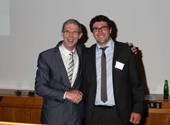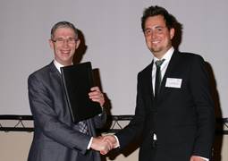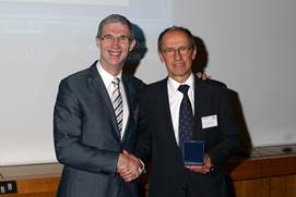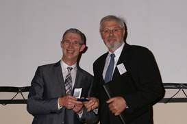 Der Vorsitzender des VDKF e.V. freut sich mit den Preisträgern: links: Dr. Paul Arendt (Koker-Medaille); rechts: Benedikt Kopietz (Förder-Preis), |